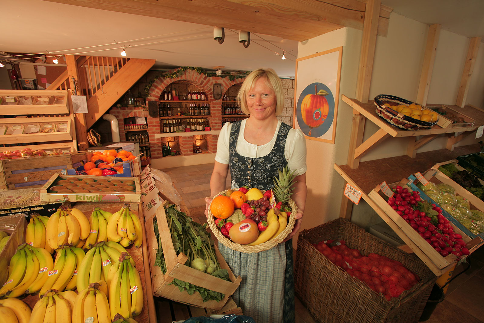 In unserem mit Gewölben rustikal und urig gestalteten Ladengeschäft finden Sie täglich Obst und Gemüse in ausgezeichneter frischer Qualität. Wo immer es irgendwie möglich ist achten wir dabei darauf, Produkte aus der erweiteren Region direkt vom Erzeuger zu beziehen.